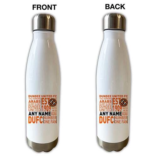 Our 500ml insulated water bottle keeps your beverage at a perfect temperature in any weather. The twist off, leak proof, cap and 304-grade stainless steel guarantees that it is durable enough for everyday use. Show your support for the club and really stand out from the crowd by personalising your water bottle with your name or message. With a sleek, design, this bottle fits into any standard size cup holder and makes for a unique and useful gift.