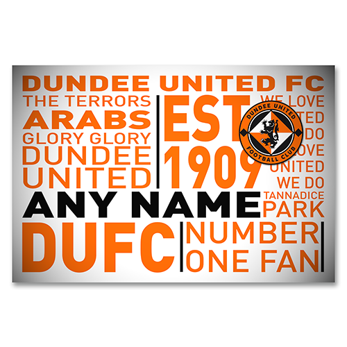 Our official personalised Dundee United Football Club printed Aluminium Wall Art makes a unique gift with a variety of uses to mark any occasion. They look great as a feature on both indoor and outdoor walls, a child’s bedroom wall, door or desk or to decorate your man or woman cave.